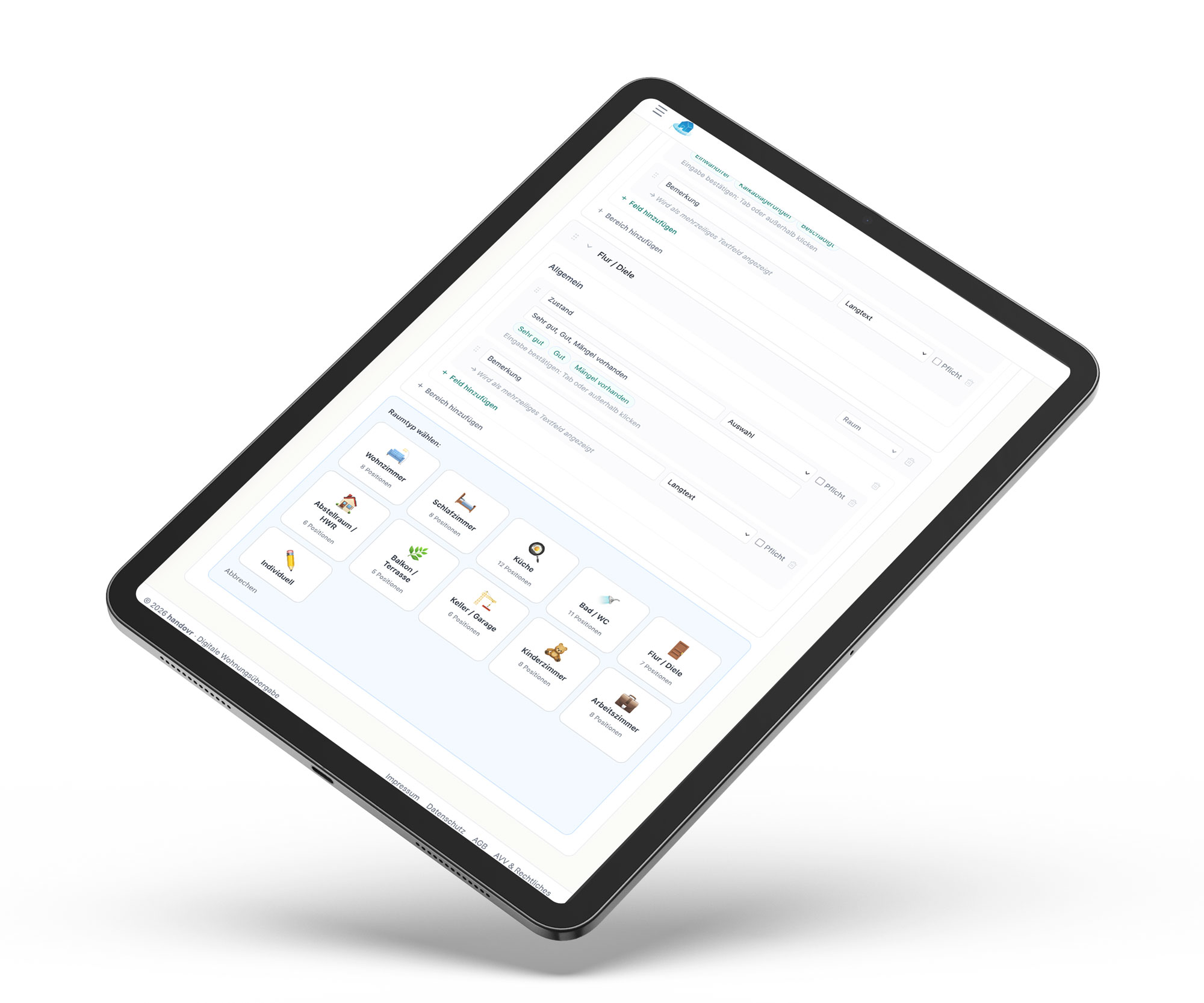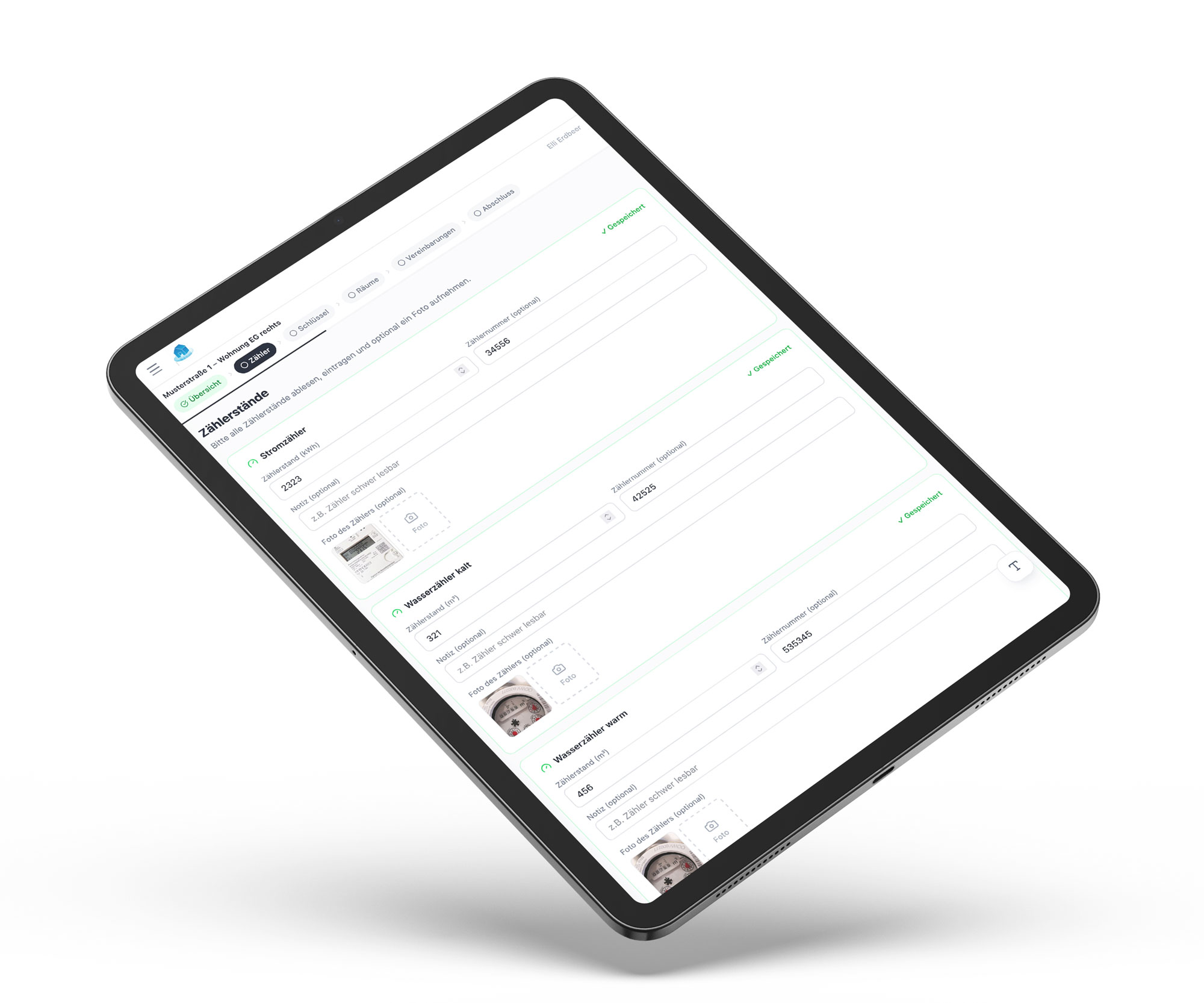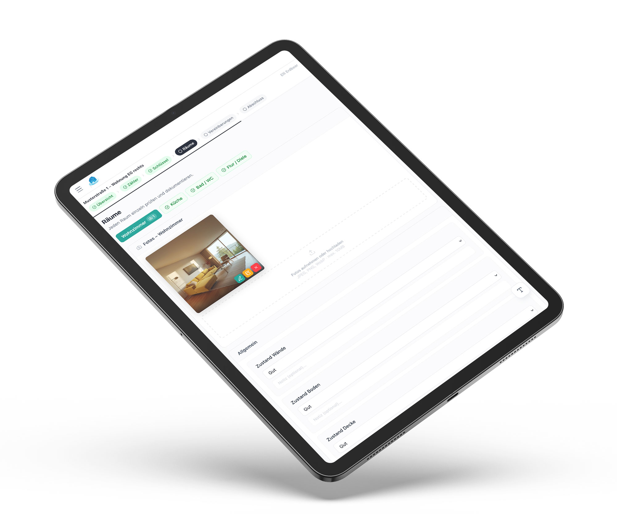 Übergabetermin starten, Räume begehen, Fotos aufnehmen und Zustand erfassen — auch auf dem Tablet vor Ort.