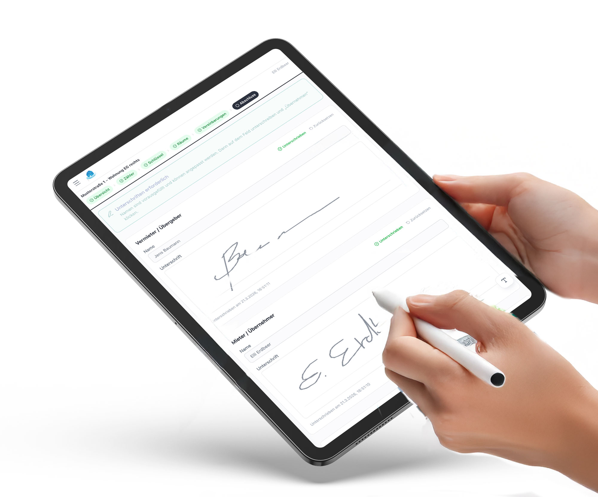 Der Protokollassistent führt Sie Schritt für Schritt durch die Wohnungsübergabe – von Zählerständen über Räume und Schäden bis zur Schlüsselübergabe und Vereinbarungen. Dabei können direkt Fotos erstellt und Schäden oder Probleme direkt auf dem Foto markiert oder festgehalten werden. Am Ende unterschreiben Mieter und Vermieter direkt auf dem Tablet und das Übergabeprotokoll wird automatisch erstellt.