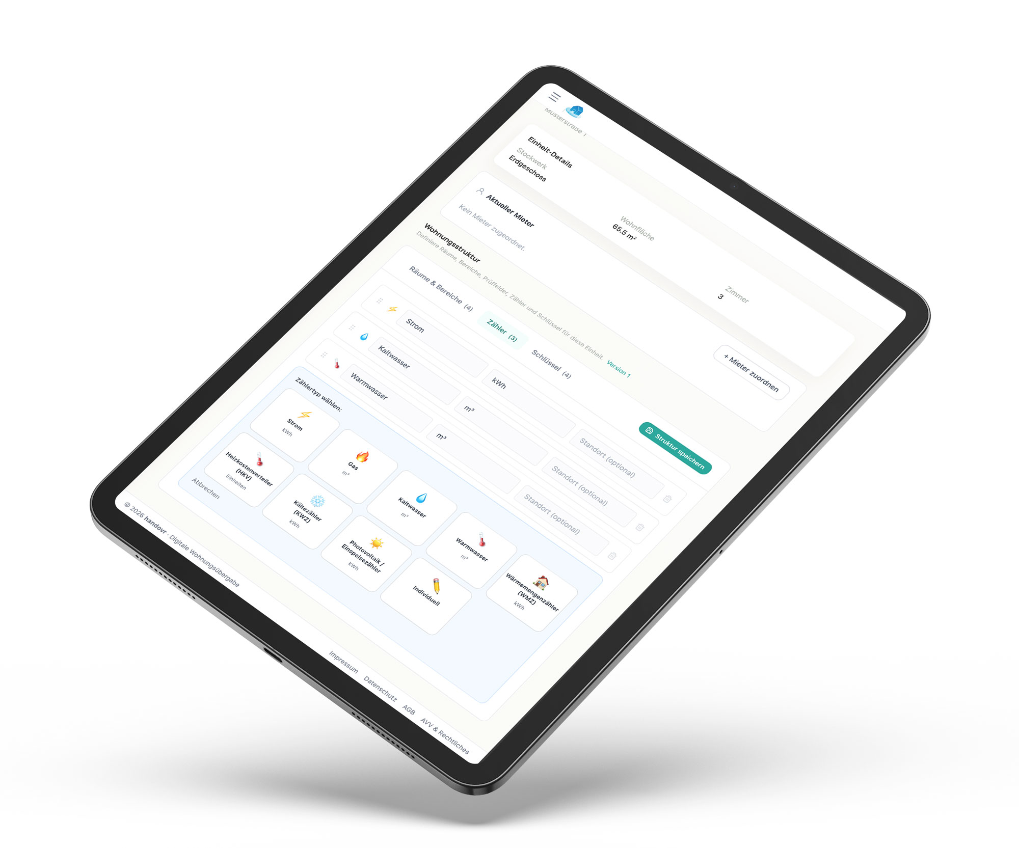 Räume, Zähler, Ausstattung und Prüfpositionen für jede Wohnung individuell definieren. Einmalig — dann wiederverwendbar.